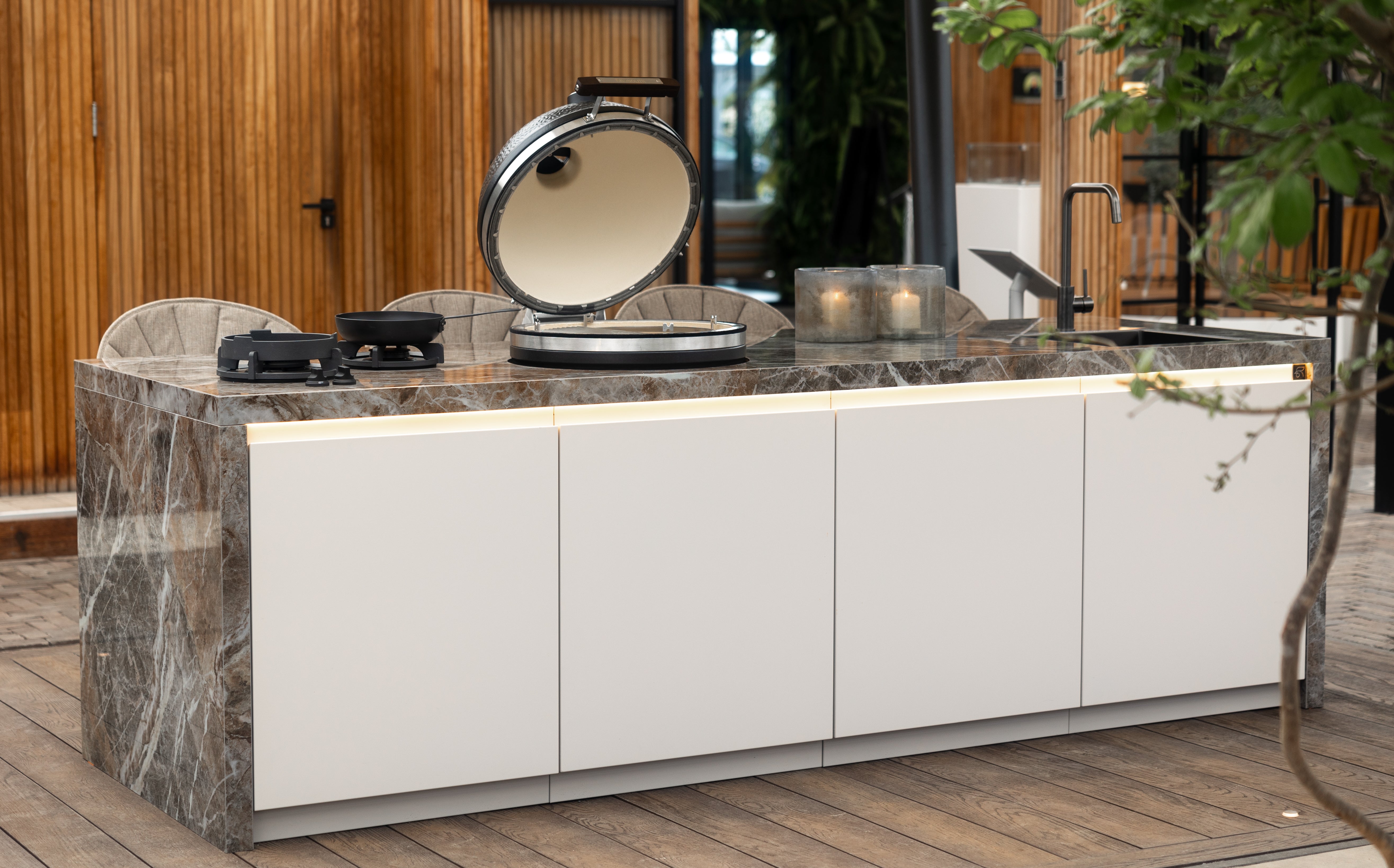 Créez le luxe d'une cuisine intérieure maintenant avec Roostr Allure aussi dans la cuisine extérieure, et prolongez votre salon à l'extérieur. Avec les mêmes propriétés que Dekton, les plans de travail de Florim sont parfaits pour l'extérieur. Avec sa résistance exceptionnelle aux UV et à la chaleur jusqu'à 250 °C, vous pouvez sans souci placer une poêle chaude directement sur le plan de travail.